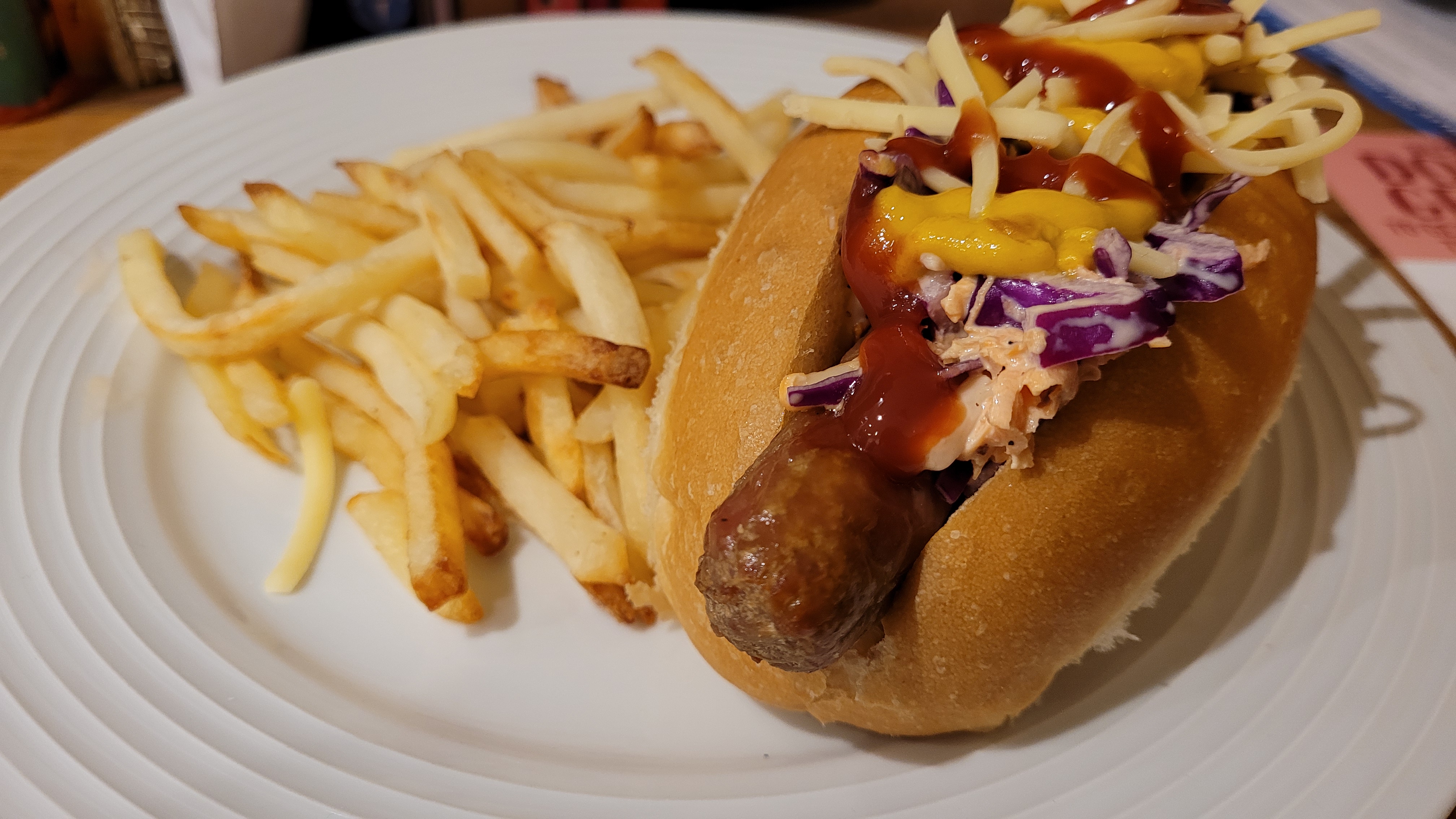 • into the open bun, place the sausage, some of the slaw, then add more grated cheese and in my preference both tomato ketchup and American mustard