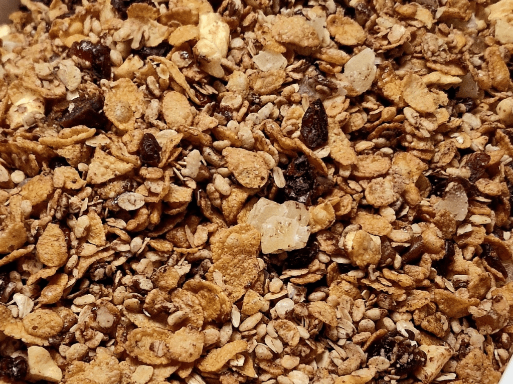 • Mix the Oats, Puffed Rice, Corn Flakes, chopped Ginger and Cinnamon in a large bowl